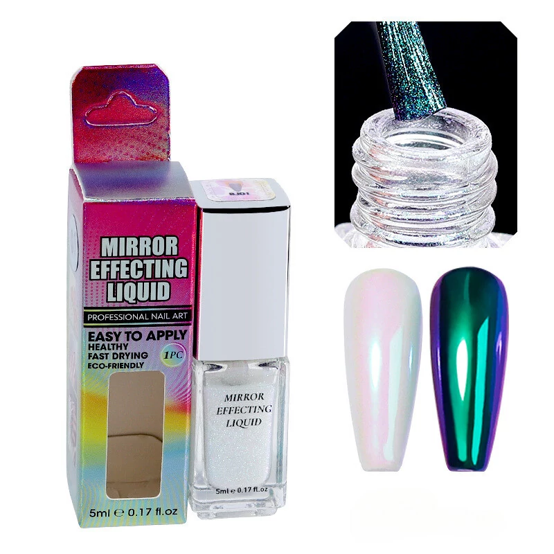 A mirror liquid körömdíszítő folyadék rengeteg különböző fajtája létezik, mindegyik más és más hatással rendelkezik a körmökön. Az egyik legnépszerűbb fajta a holografikus tükröző folyadék, amely csodás szivárványszínű hatást kölcsönöz a körmöknek.