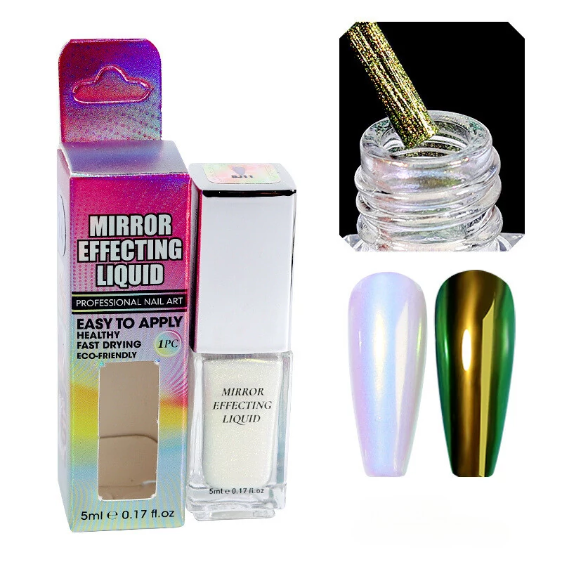 A mirror liquid körömdíszítő nagy népszerűségnek örvend a körömdíszítés területén, és számos előnnyel rendelkezik a hagyományos effekt porokkal szemben. Ezek közé tartozik először is az egyszerű felhordás. A mirror liquid könnyen és gyorsan felvihető a körömre, és nem igényel különösebb szakértelmet vagy technikai tudást. Így akár otthon is könnyedén elkészíthetjük vele a tökéletes tükröző hatást a körmeinkre.